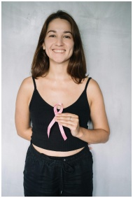 Portrait of a smiling woman holding a pink ribbon to support breast cancer awareness.