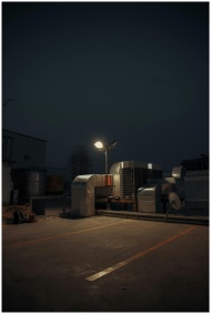Dark and atmospheric rooftop view with HVAC system and streetlight on a cloudy night.