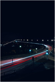 Stunning aerial shot of Tromsø at night showing city lights and road trails in Norway.