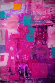 Dynamic abstract painting featuring bold pink and