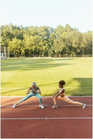 Two women performing stretching exercises on a sunny outdoor track, emphasizing fitness and health.