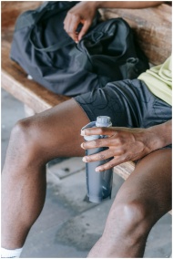 A close-up of an athlete sitting on a bench, holding a water bottle, ready for exercise.