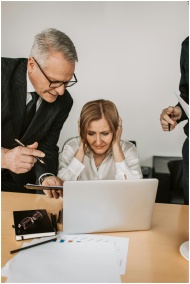 Business professionals engaged in project discussion over a laptop in an office setting.