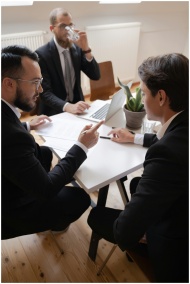 Three businessmen engaged in discussion during a formal meeting in an office setting.