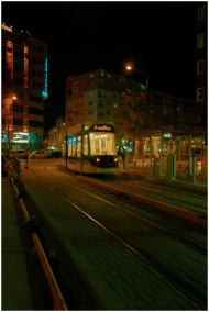 Tram navigating the lively Eskişehir city streets at night, showcasing urban public transportation.