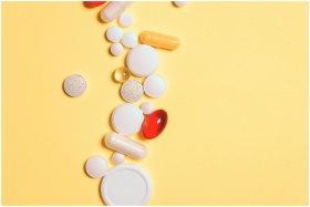 A collection of assorted pills and capsules on a vibrant yellow surface.