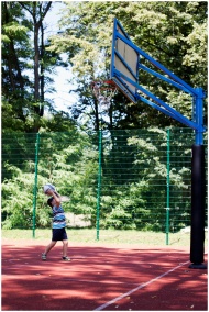 A child playing basketball on an outdoor court surrounded by trees on a sunny day.