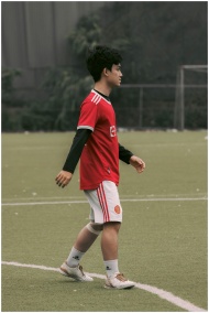 A young male athlete plays soccer on a field in Hanoi, Vietnam, showcasing his skills.