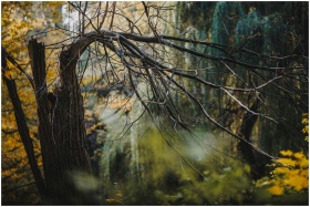 A tranquil autumn landscape featuring a broken tre