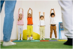 A diverse group of children enjoying indoor exercise, promoting fun and fitness.