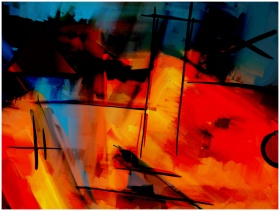 A colorful abstract painting with bold strokes and dynamic shapes.
