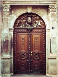 Intricate carved vintage wooden door with detailed arch and decorative elements.