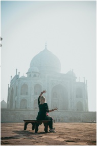 A woman poses with raised arms in front of the Taj Mahal, Agra. Captivating travel photo.
