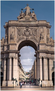 Historical arch in Praça do Comércio, Lisbon. Iconic architecture and popular tourist attraction.