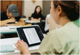 Students in a Japanese classroom using a tablet fo