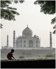 A child sits on a wall with the iconic Taj Mahal visible in the background at sunset, Agra, India.