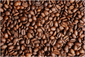 Close-up view of fresh brown coffee beans in a heap, showcasing their texture and abundance.