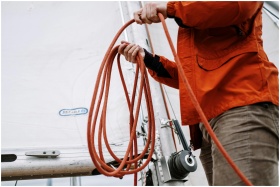 Close-up of a sailor handling ropes on a sailing boat, showcasing nautical skills and equipment.