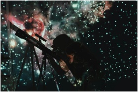 A girl looks through a telescope at a starry projection, blending education with wonder.
