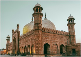 Capture of Badshahi Mosque showcasing magnificent Mughal architecture at dusk in Lahore, Pakistan.