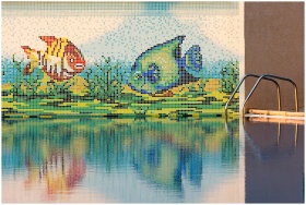 Colorful mosaic fish decor with pool reflection, p