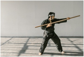 Martial artist in black gi practicing with bo staf