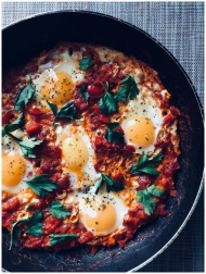 Close-up of a flavorful shakshuka with eggs, tomatoes, and herbs, perfect for a hearty breakfast or brunch.