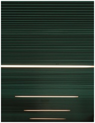 Abstract view of modern ceiling with linear lights and dark tones.