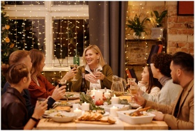 A joyful family gathering around a festive Christmas dinner table indoors, full of smiles and holiday cheer.