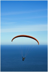 A person paragliding with an orange chute over a vast ocean under clear blue skies.