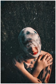 From above of melancholic injured anonymous female with head and face covered with bandage and paints on body
