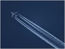 High-altitude airplane leaving contrails in a clea
